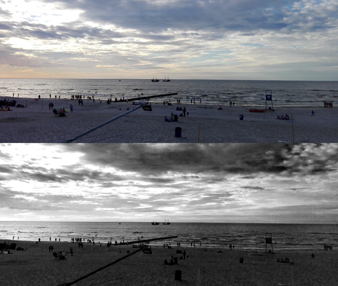 | Zdjęcie przed zastosowaniem (na górze) i po zastosowaniu (na dole) filtru Skala szarości. |